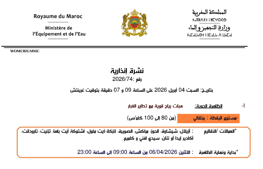 أفادت المديرية العامة للأرصاد الجوية بأن يوم الاثنين المقبل سيشهد اضطرابات جوية مهمة، حيث يرتقب تسجيل هبات رياح قوية تتراوح سرعتها بين 80 و100 كلم في الساعة، مرفوقة بتطاير الغبار، في عدد من مناطق المملكة.