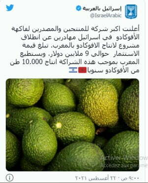 وعلى حسابها الناطق باللغة العربية “إسرائيل بالعربية”، في “تويتر”، قالت إسرائيل: ” أعلنت أكبر شركة للمنتجين والمصدرين لفاكهة الأفوكادو في إسرائيل “مهادرين”، عن انطلاق مشروع لإنتاج الافوكادو بالمغرب”.