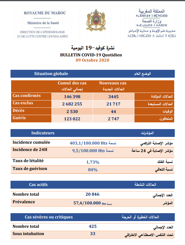 عاجل… ارتفاع قياسي في عدد المصابين الجدد بعدوى كورونا وحصيلة اليوم تثير المخاوف مختارات أنا الخبر | Analkhabar نشر في: الجمعة 9 أكتوبر 2020 - 18:22 | آخر تحديث: الجمعة 9 أكتوبر 2020 - 18:22
