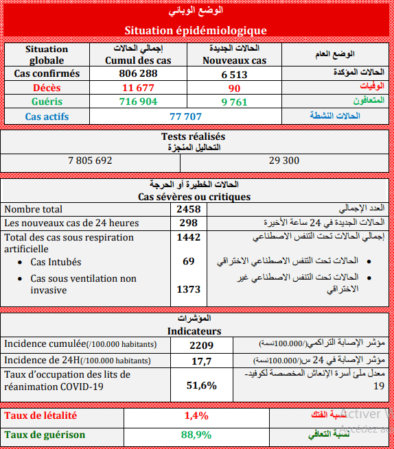 ووفق المصدر ذاته فإن مجموع التحاليل المنجزة، عقب إجراء 29300 من الفحوصات خلال المدة نفسها، قد بلغ 7805692 منذ بداية انتشار الفيروس على المستوى الوطني؛ في 2 مارس من العام الماضي.