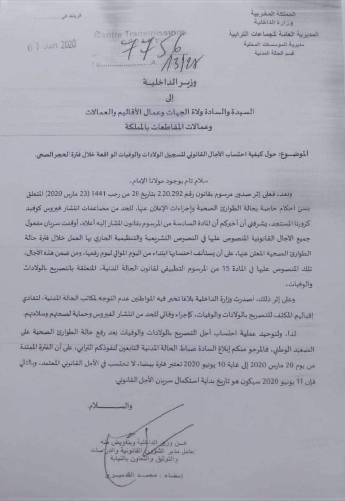 ووفق المراسلة الموجهة من طرف وزير الداخلية للولاة والعمال بشأن كيفية احتساب الاجال القانونية لتسجيل الولادات والوفيات الواقعة خلال فترة الحجر الصحي، فإن الولاة والعمال مدعوين لابلاغ ضباط الحالة المدنية، فإن الفترة الممتدة من 20 مارس إلى 10 يونيو 2020 تعتبر فترة بيضاء لا تحتسب في الاجل القانوني المعتمد، وبالتالي فإن 11 يونيو 2020 سيكون هو تاريخ بداية استكمال سريان الاجل القانوني.