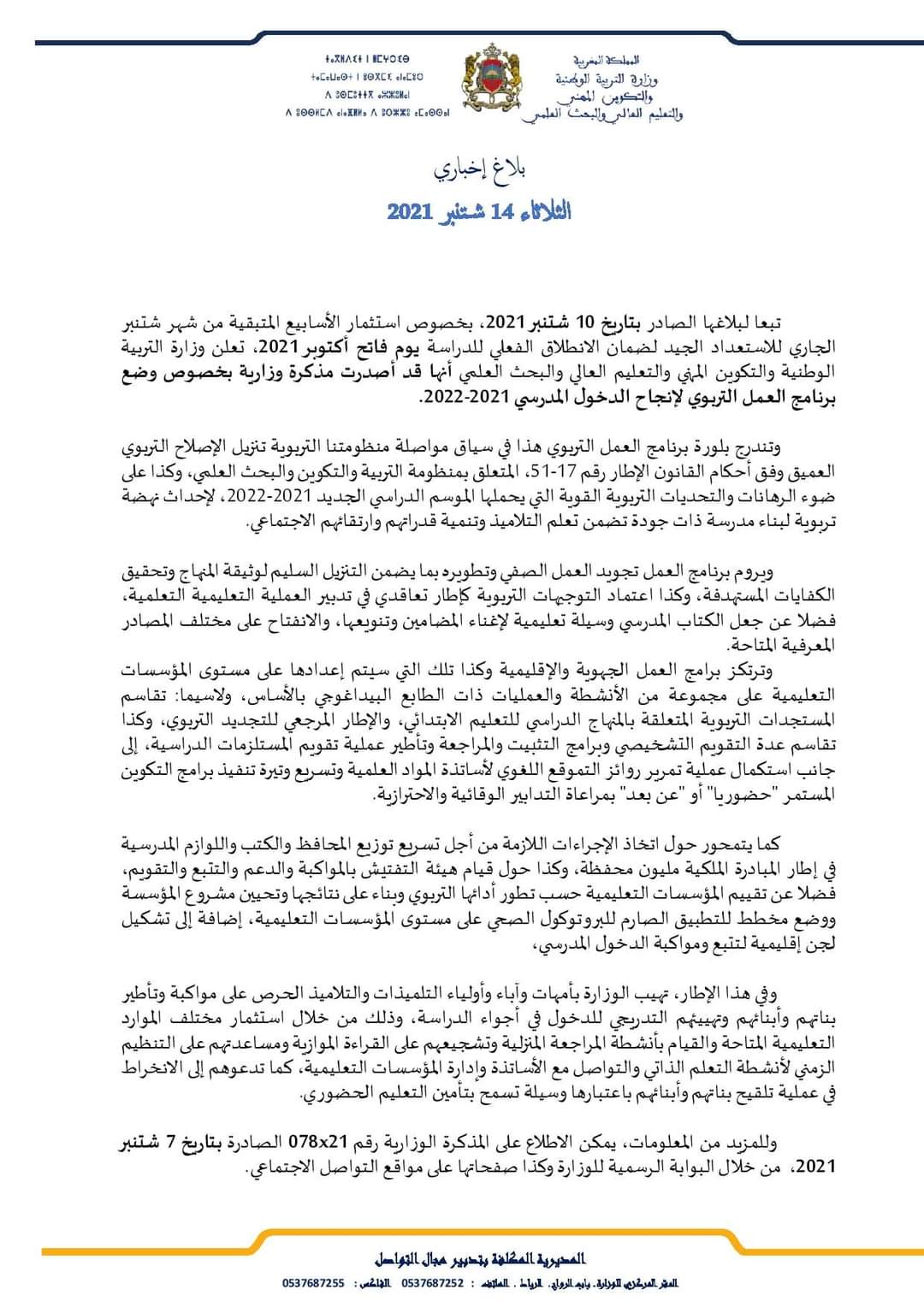 عاجل: وزارة التربية الوطنية تصدر بلاغا هاما بخصوص الدخول المدرسي مختارات أنا الخبر | Analkhabar نشر في: الثلاثاء 14 سبتمبر 2021 - 21:50 | آخر تحديث: الثلاثاء 14 سبتمبر 2021 - 21:50 أصدرت وزارة التربية الوطنية بلاغا إخباريا بخصوص إصدار مذكرة وزارية متعلقة بوضع برنامج العمل التربوي لانجاح الدخول المدرسي 2021-2022. #أخبار المغرب#أنا الخبر#الدخول المدرسي#بلاغ#وزارة التربية الوطنيةأخبار المغرب