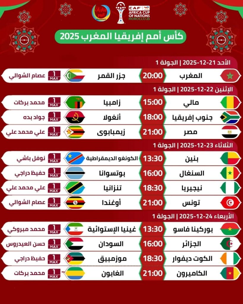 تنطلق الأحد، 21 دجنبر الجاري، نهائيات كأس أفريقيا التي يحتضنها المغرب، وهي النسخة التي يحبس العالم أنفاسه انتظاراً لها. البطولة التي ستستمر حتى 18 يناير 2026، تبدأ بمباريات طاحنة في دور المجموعات، حيث يسعى كبار القارة لتأكيد حضورهم، بينما تطمح الفرق الصاعدة لإحداث المفاجأة في “أرض الأسود”.