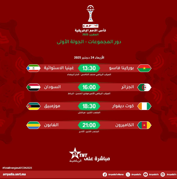 تتواصل اليوم الأربعاء 24 ديسمبر 2025، إثارة الجولة الأولى من دور المجموعات لكأس أفريقيا المقامة في المملكة المغربية. وسيكون عشاق الكرة الأفريقية على موعد مع 4 مباريات حارقة موزعة على مختلف الملاعب المغربية، أبرزها الجزائر والسودان.