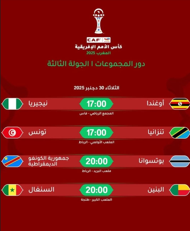 تدخل بطولة كأس إفريقيا 2025 بالمغرب، اليوم الثلاثاء 30 دجنبر الجاري، واحدة من أكثر مراحلها حساسية مع إجراء مباريات الجولة الثالثة والأخيرة من دور المجموعات، حيث لا مكان للأخطاء ولا مجال للحسابات النظرية. أربع مباريات تُلعب في توقيت موحد داخل كل مجموعة، ونتائجها سترسم بشكل نهائي خريطة المتأهلين إلى الدور الثاني، بين منتخبات ضمنت العبور وأخرى تلعب آخر أوراقها.