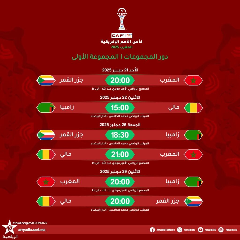 | الجمعة 26 ديسمبر 2025 | 18:30 | جزر القمر ضد زامبيا | المركب الرياضي محمد الخامس – الدار البيضاء |