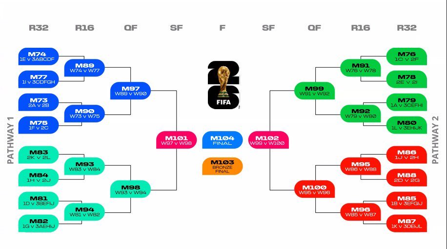 وفقًا للمعلومات التي كشف عنها FIFA، والتي تُجسدها خريطة المباريات الإقصائية الجديدة (الموضحة في المخطط)، سيتم تقسيم الفرق في الأدوار الإقصائية إلى “مسارين” (Pathway 1 و Pathway 2) محددين بوضوح. الهدف الأساسي من هذا التقسيم هو ضمان عدم تقابل بعض المنتخبات المصنفة كأفضل المرشحين قبل الدور النهائي (M104)، شريطة أن تحقق هذه المنتخبات شرطًا أساسيًا وهو تصدّر مجموعاتها في الدور الأول.