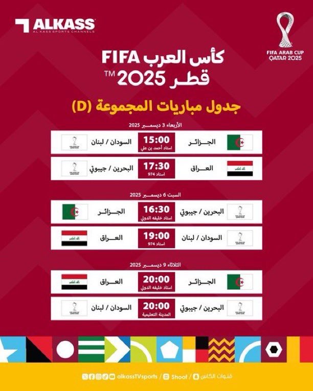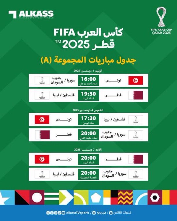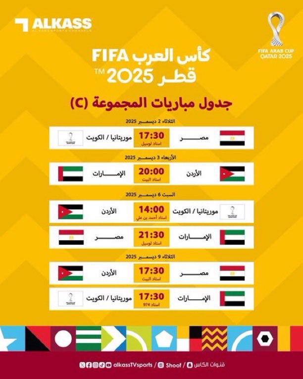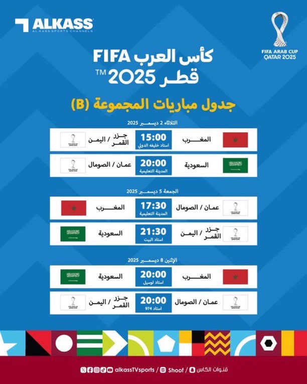 - ملاحظة: للاطلاق على البرنامج الكامل لكاس العرب 2025 بقطر يمكن زيارة موقع فيفا الرسمي من هذا: الرابط