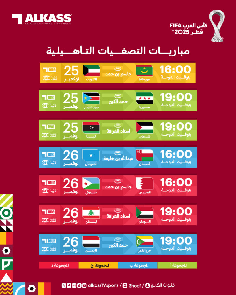 | الأربعاء | 26 نوفمبر 2025 | عُمان ضد الصومال | 14:00 |
