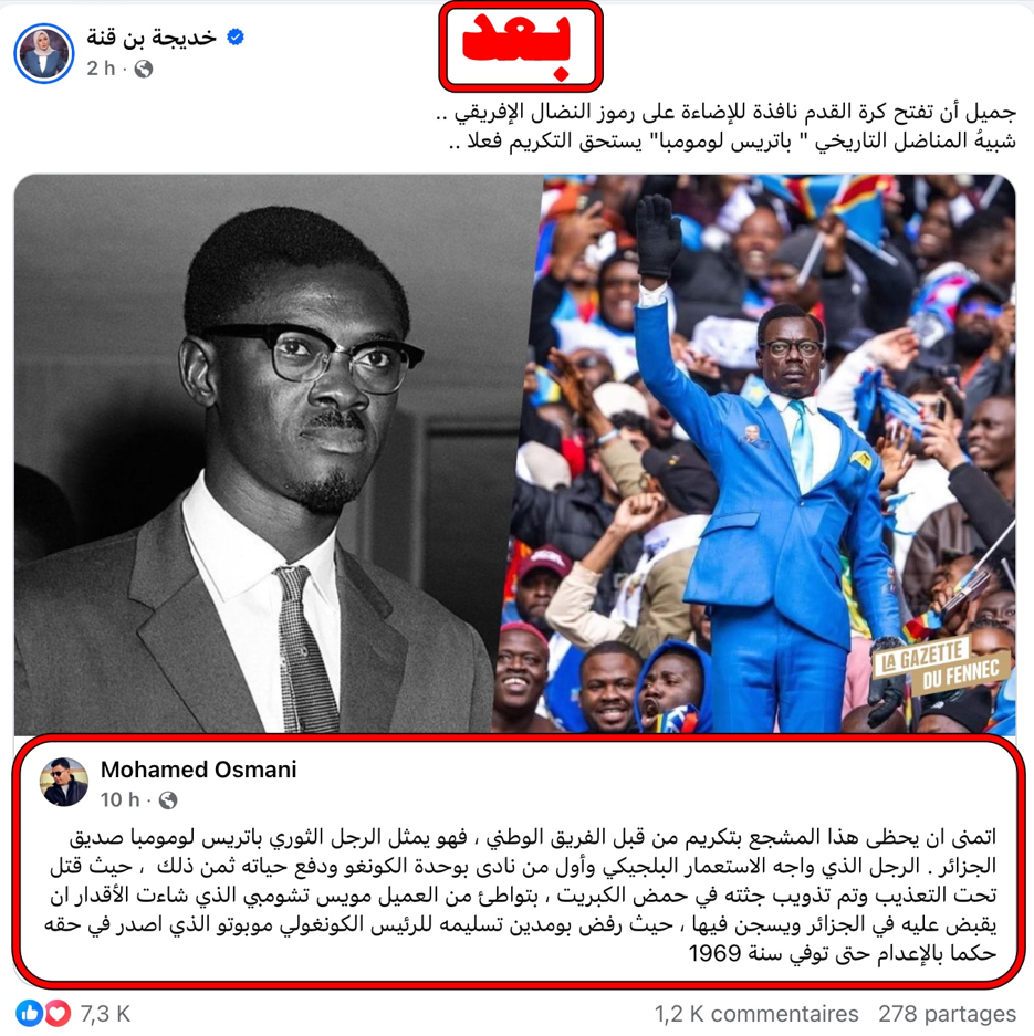 وفي منشورها الثاني أسفله، تحول المشجع الذي سخرت منه بالأمس إلى “أيقونة” تشبه المناضل التاريخي باتريس لومومبا. فجأة، صار الرجل “يستحق التكريم فعلاً”، وصارت الإعلامية تتحدث عن “رموز النضال الإفريقي” وتستحضر التاريخ والسياسة لتغطي على سقطتها الإنسانية. هذا التحول الجذري لم يكن تراجعاً عن خطأ، بل كان محاولة “تنظيف” رقمية للملف الشخصي، وهروباً إلى الأمام من مقصلة النقد التي لا ترحم المنافقين.