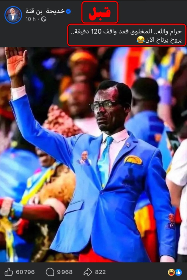 بدأت الحكاية حين قررت خديجة بن قنة أن تجعل من ملامح مشجع كونغولي بسيط مادة للضحك والتهكم. ففي منشورها الأول (أنظر الصورة أسفله)، لم ترَ الإعلامية في ذلك الرجل الذي وقف يشجع بلده بحرارة طيلة 120 دقيقة سوى فرصة “للتنكيت” واستصغار جهده وعفويته، معلقة بأسلوب فيه الكثير من التعالي: “حرام والله.. المخلوق قعد واقف 120 دقيقة.. يروح يرتاح الآن”، مع إيموجي ضاحك يختصر نظرتها الدونية للإنسان البسيط. وكانت تظن أن الصورة ستمر كغيرها من منشورات “التنمر الناعم”، لكنها لم تكن تعلم أن ذكاء المتابع المغربي والعربي سيلتقط هذا التناقض الأخلاقي ويردعه في الحين.
