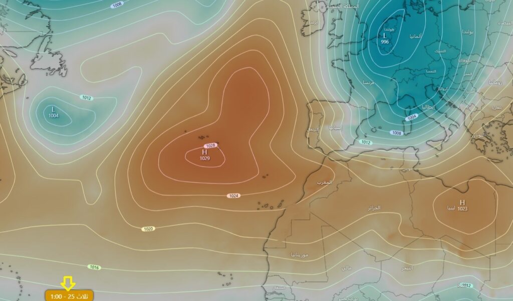 في قلب هذا المشهد الجوي تتربع منظومة ضغط عالية القوة، يمثلها المرتفع الآصوري الذي يتمركز غرب القارة الإفريقية بضغط يتجاوز 1029 h. ;لا يكتفي هذا المرتفع بالبقاء في موقعه المعتاد، بل يمد نفوذه بقوة نحو الشرق، ليتصل عملياً بمنطقة الضغط المرتفع المستقرة فوق الصحراء الكبرى، فيما يمكن تسميته مجازاً بالمرتفع الإفريقي/الصحراوي.