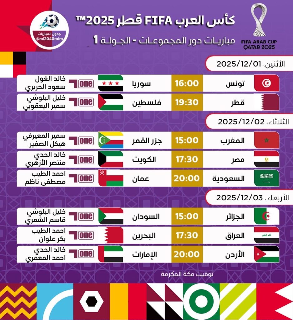 جدول معلقي مباريات الجولة الأولى من منافسات كأس العرب 2025 بالصورة: