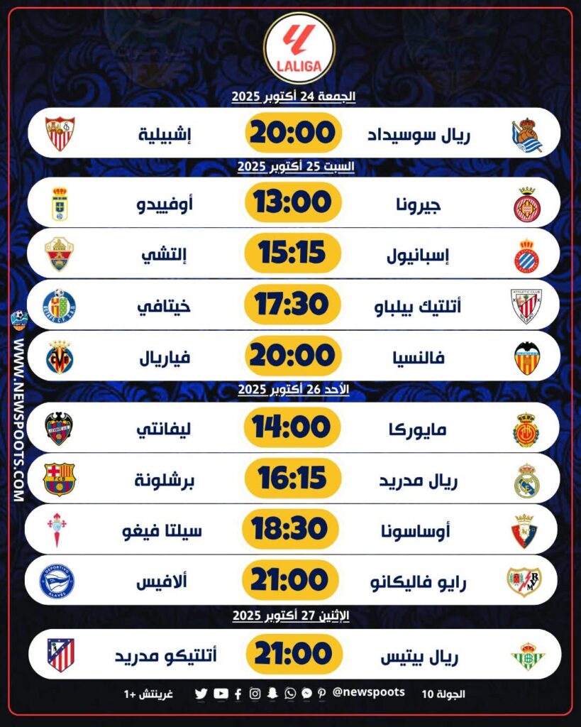 تتجه الأنظار هذا الأسبوع إلى ملاعب الدوري الإسباني، حيث تشتعل المنافسة مع انطلاق الجولة العاشرة، والتي تحمل في طياتها الحدث الأبرز في كرة القدم العالمية: قمة “الكلاسيكو” بين عملاقي إسبانيا، برشلونة وريال مدريد. هذه الجولة تبدأ يوم الجمعة وتنتهي ليلة الإثنين، بقمة أخرى بين أتلتيكو مدريد وريال بيتيس.