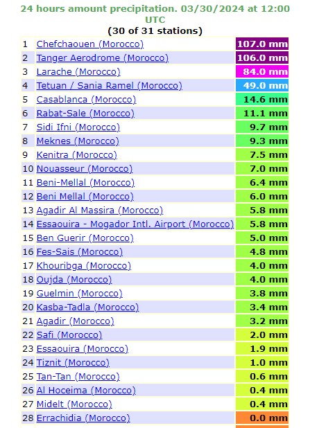 سجلت ولله الحمد عددا من المدن المغربية خلال 24 ساعة الأخيرة، تساقطات مطرية مهمة، أعلاها بمدينة شفشاون، حيث وصلت إلى 107 ملم إلى غاية منتصف نهار اليوم السبت، لتتبعها مدينة طنجة ب106 ملم ثم مدينة العرائش ب 84 ملم.