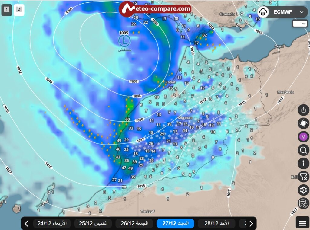 تُجمع النماذج العددية المتقدمة على أن التساقطات المطرية ستكون قوية إلى محلياً غزيرة، حيث من المتوقع أن تتجاوز الكميات حاجز 70 ملم خلال 24 ساعة فقط، وذلك في الفترة الممتدة من ليلة الجمعة/السبت إلى غاية يوم الأحد.