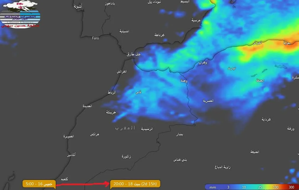 كما يمتد تأثير السحب الماطرة بشكل متقطع إلى جنوب شرق إسبانيا وشمال شرق المغرب.