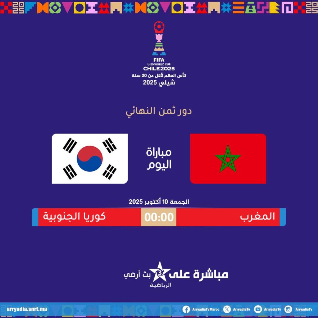 في مواجهة حاسمة تحمل آمال القارة الإفريقية، يستعد منتخب المغرب لأقل من 20 سنة لملاقاة نظيره الكوري الجنوبي، في إطار دور ثمن نهائي كأس العالم للشباب المقامة بدولة التشيلي، وذلك بداية من منتصف ليلة اليوم الخميس 9 أكتوبر/الجمعة 10 أكتوبر 2025.