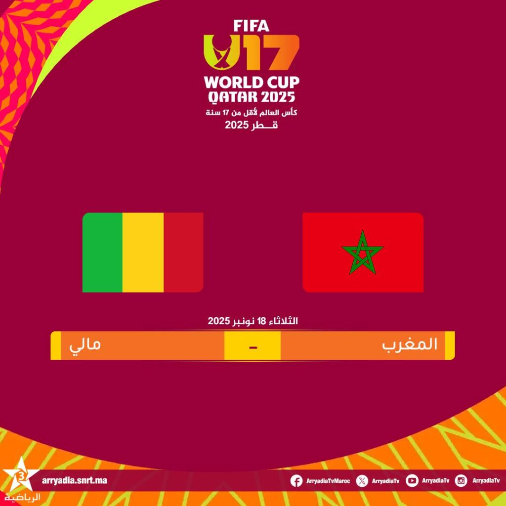 المنتخب المغربي لأقل من 17 سنة يتأهل لثمن نهائي كأس العالم بقطر بعد فوزه على أمريكا. سيواجه المغرب مالي في الدور القادم يوم الثلاثاء 18 نوفمبر 2025. المباراة ستُذاع على بين سبورت المفتوحة والرياضية TNT. تأهل مالي بعد فوزه على زامبيا.