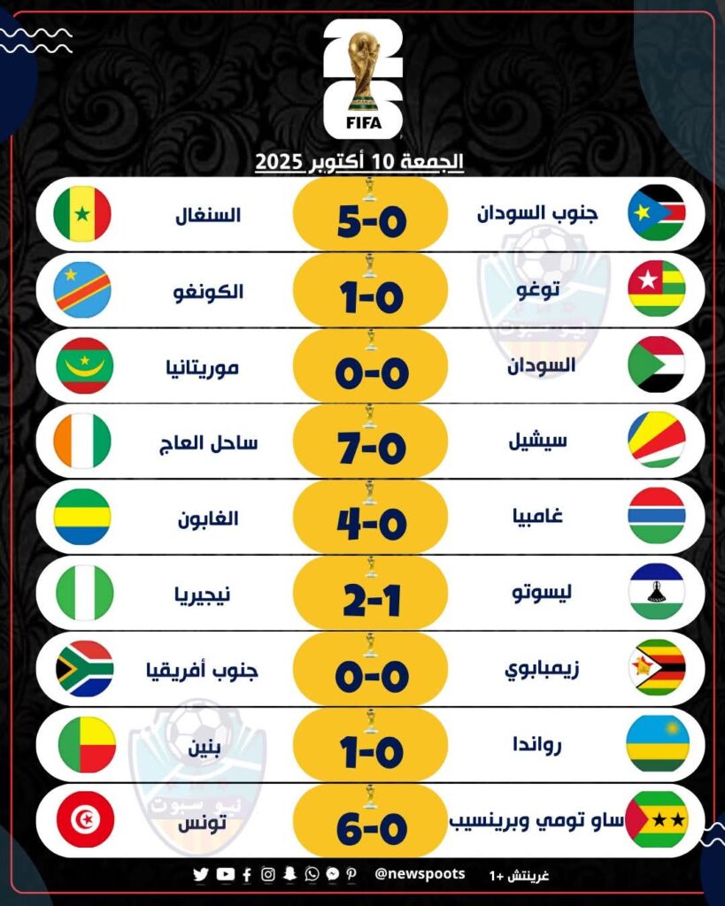 - 🇸🇳 السنغال تؤكد قوتها الهجومية بفوز ساحق على جنوب السودان (5-0).