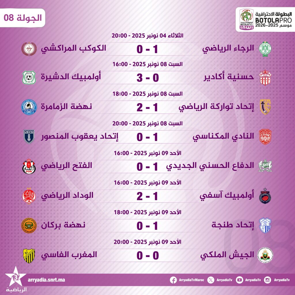 اختُتمت مساء الأحد 09 نوفمبر 2025 منافسات الدورة الثامنة من البطولة الوطنية الاحترافية “إنوي” لكرة القدم – القسم الأول، والتي عرفت تسجيل 13 هدفا في المجموع وهي تبقى حصة تهديفية متوسطة.