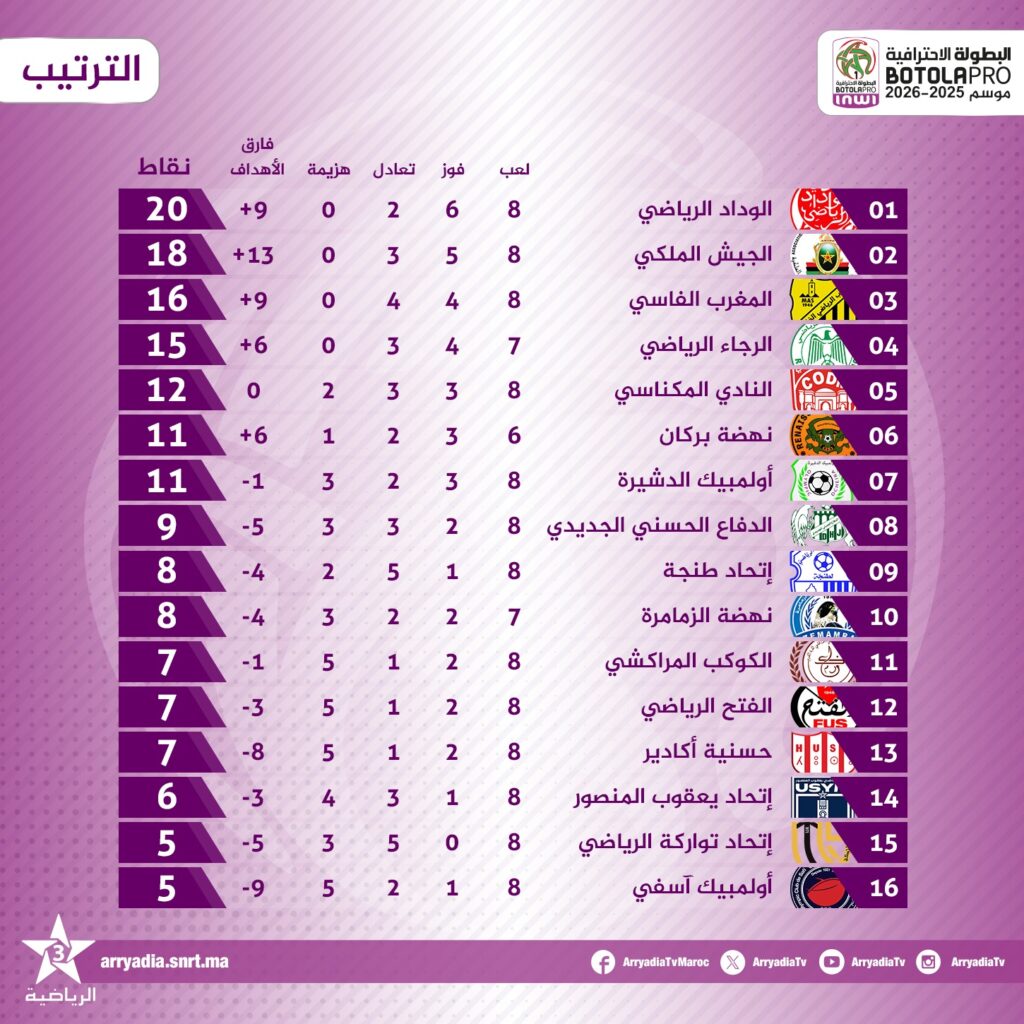 - الوداد الرياضي واصل سلسلة انتصاراته واحتفظ بالصدارة بـ20 نقطة.