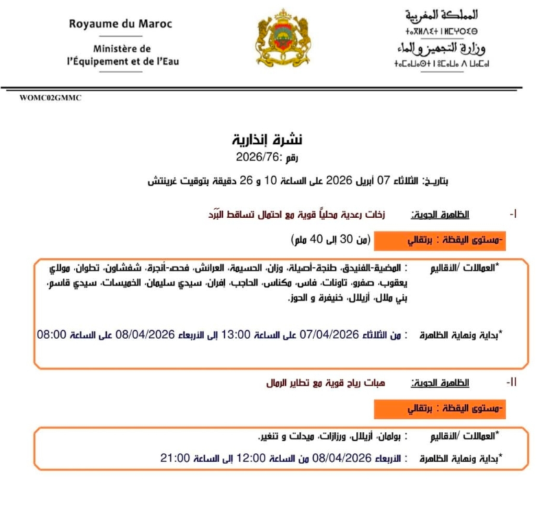 وتأتي هذه النشرة الإنذارية (رقم 2026/76) لتنبه المواطنين ومستعملي الطريق في المناطق المذكورة إلى ضرورة توخي الحيطة والحذر، خاصة أثناء القيادة في فترات الزخات الرعدية القوية أو في المناطق التي قد تشهد تطايراً للرمال، حفاظاً على سلامتهم وسلامة ممتلكاتهم.
