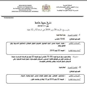 أصدرت مديرية الأرصاد الجوية الوطنية، نشرة إنذارية خاصة من المستوى البرتقالي، بسبب رياح قوية وأمطار عاصفية مرتقبة.