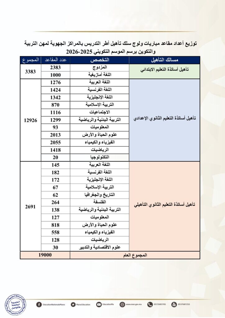 وأوضح البلاغ الرسمي لوزارة التربية الوطنية، أن الاختبار الكتابي لهذه المباريات سيجرى يوم 22 نونبر المقبل، مشيرًا إلى أن عدد المقاعد المتبارى عليها يبلغ 19 ألف مقعد، موزعة على مسالك: