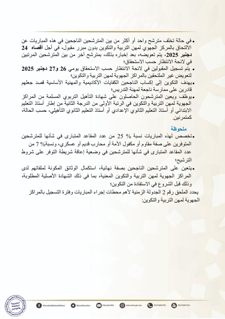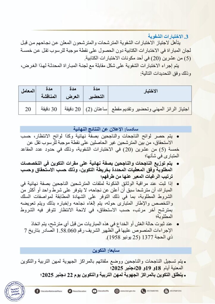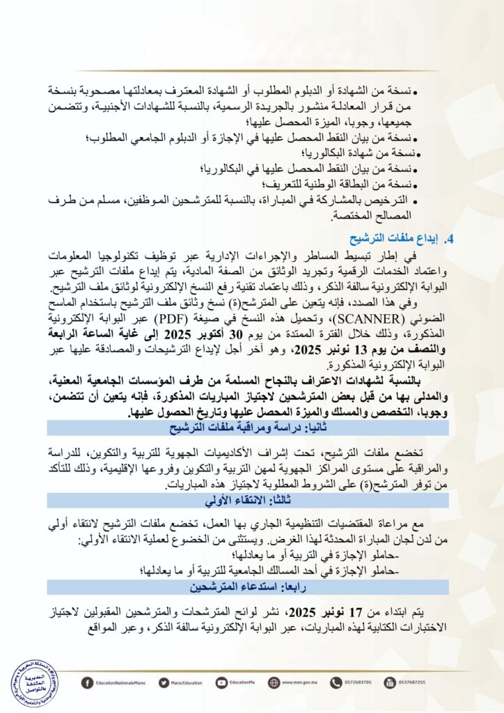 أكدت الوزارة أن الترشح لاجتياز الاختبارات الكتابية يتم عبر البوابة الرسمية: wolouj.men.gov.ma، خلال الفترة الممتدة من 30 أكتوبر إلى الساعة الرابعة والنصف من يوم 13 نونبر 2025، وهو آخر أجل لإيداع الترشيحات.