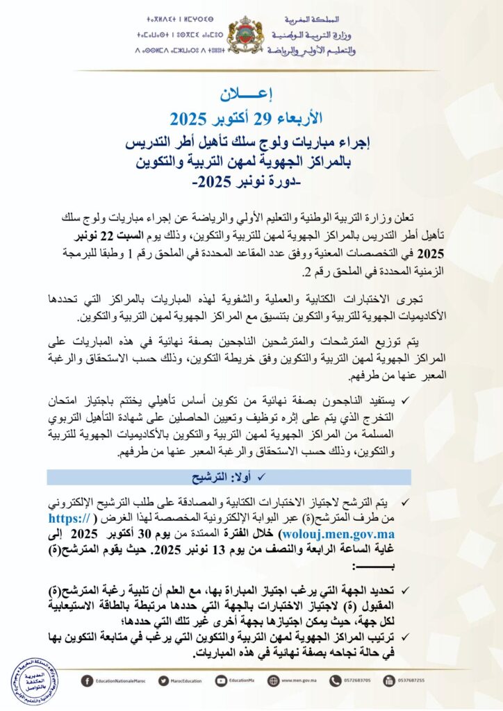 أعلنت وزارة التربية الوطنية والتعليم الأولي والرياضة عن تنظيم مباريات ولوج سلك تأهيل أطر التدريس بالمراكز الجهوية لمهن التربية والتكوين برسم دورة نونبر 2025، في إطار تعزيز الموارد البشرية المؤهلة في قطاع التعليم.