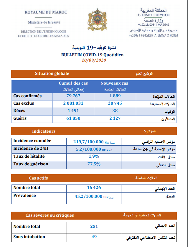 1889 إصابة جديدة وها التوزيع ديالها حسب المدن مختارات أنا الخبر | Analkhabar نشر في: الخميس 10 سبتمبر 2020 - 18:10 | آخر تحديث: الخميس 10 سبتمبر 2020 - 18:17