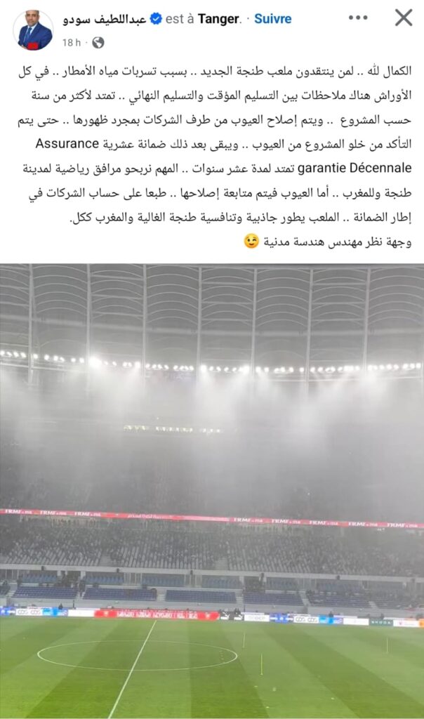 هذه المسألة ليست سراً على متابعي سير الأشغال، حيث لا تزال الفجوات بين أغطية السقف مفتوحة، مما يفسر تماماً دخول بعض مياه الأمطار إلى المدرجات، وهو أمر كان متوقعاً ولم يشكل مفاجأة على الإطلاق.